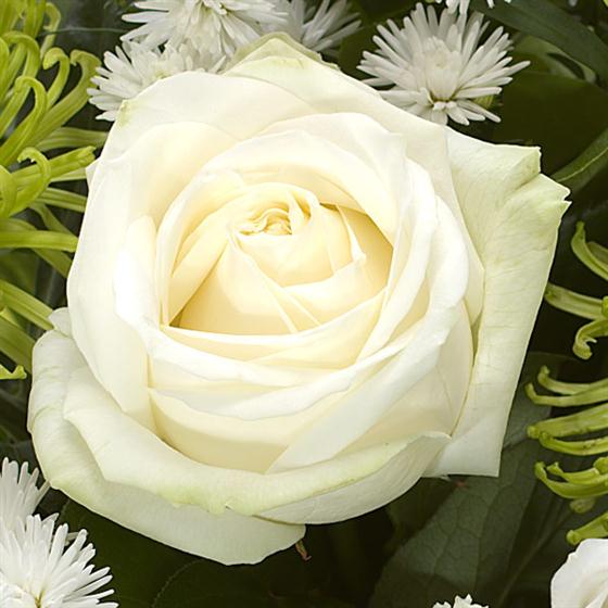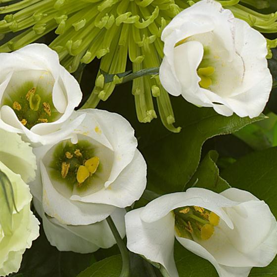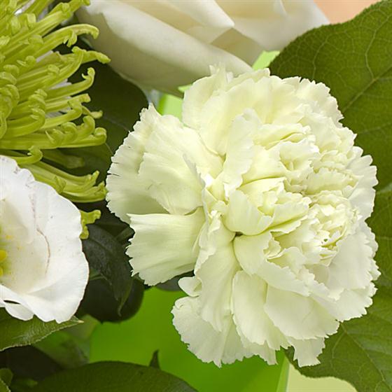 Green and white for sheer elegance shown here with green bloom Chrysanthemum, palest green Carnations, white Roses, Lisianthus and September Flower.