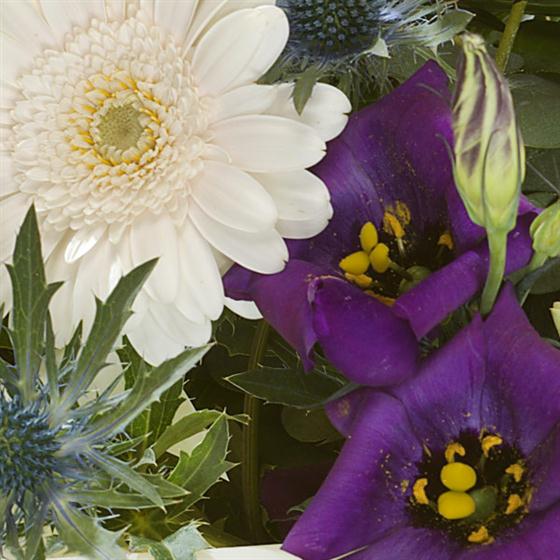 A serene hand-tied of white Roses and Lilies, purple Aconitum and Lisianthus.