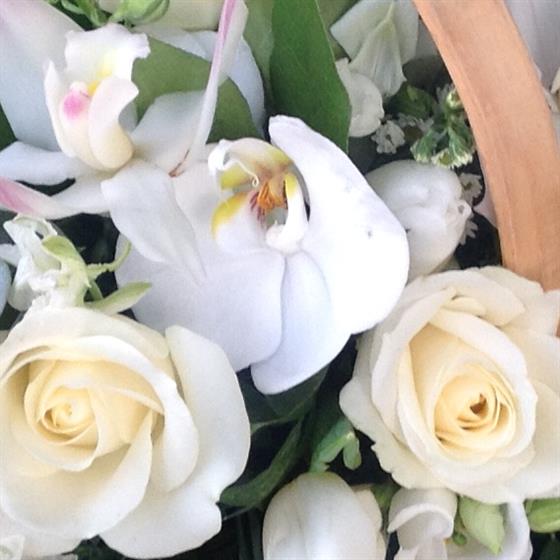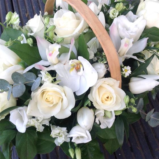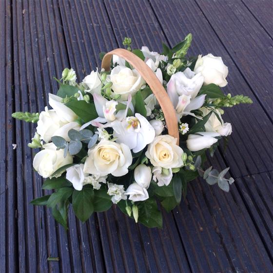 All white glower display arranged in a Trug basket