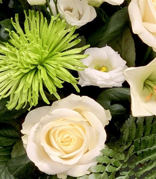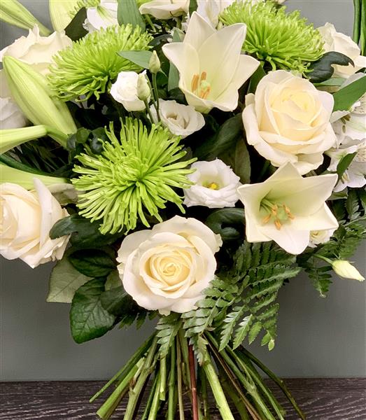 Classic white and green bouquet including roses , green anastasia blooms , white lilies, and white lissianthus