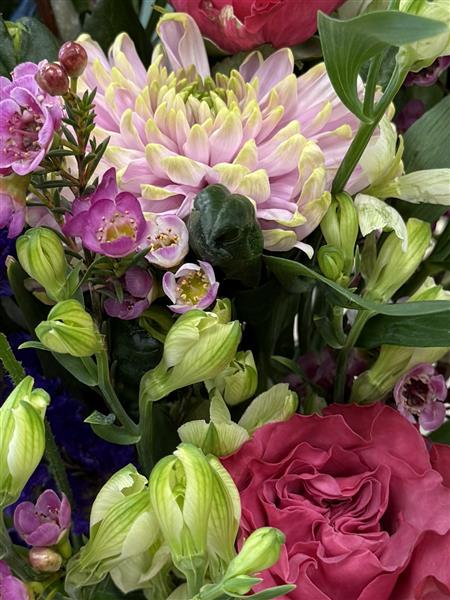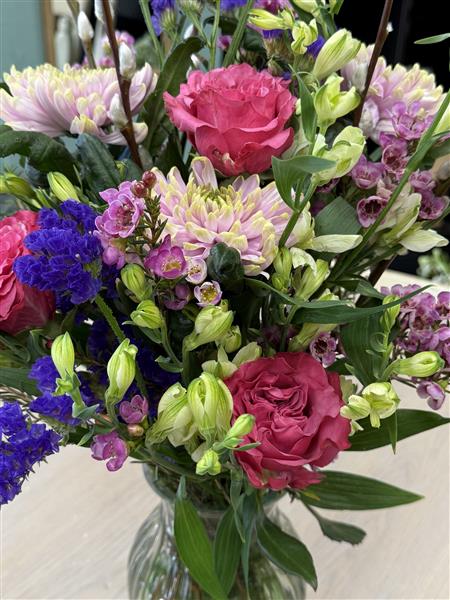 Vase display with a lovely mix of pinks and mauves including roses , alstromeria sand charlotte blooms
