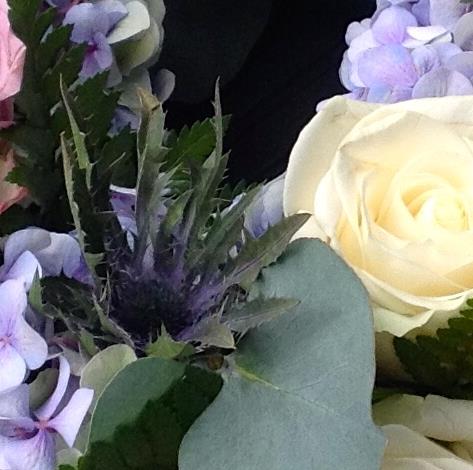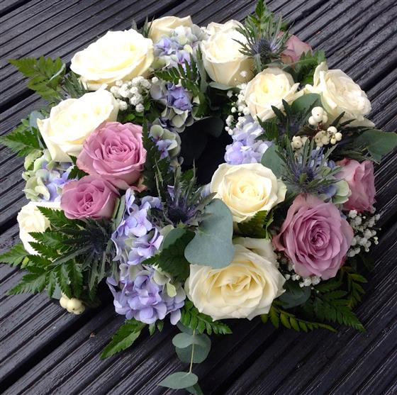 Classic wreath in shades of blue and white. Seasonal flowers are always used and my vary.