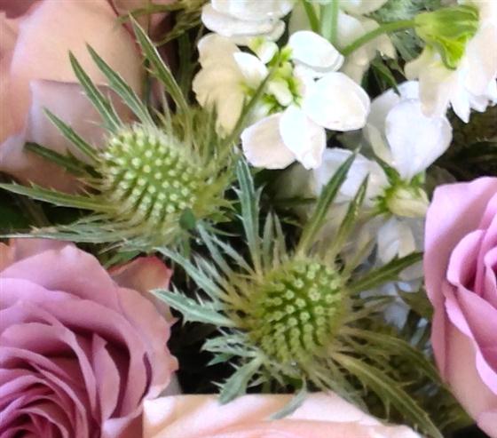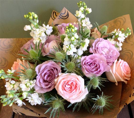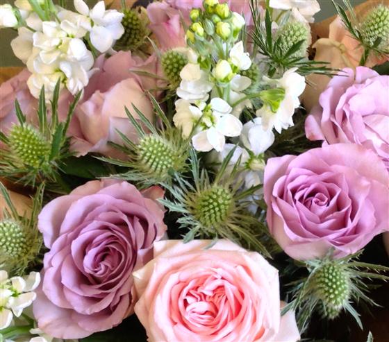 Soft and delicate roses ,combine with white stocks and seasonal fillers