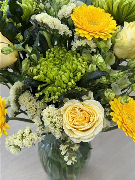 Vase display with Lemon roses , white pearl alstromeria , yellow gerberas combine to make a sunshine bouquet .