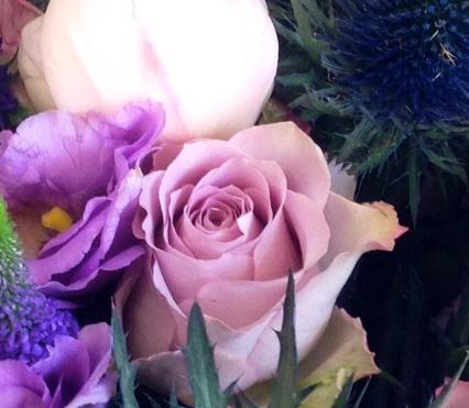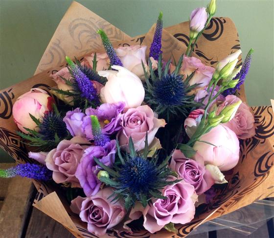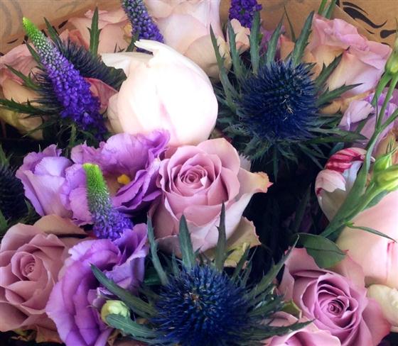 Soft lilac shades make a beautiful combination.Includes roses and lissianthus.