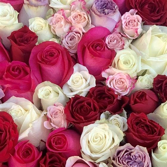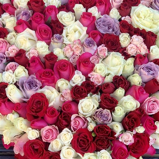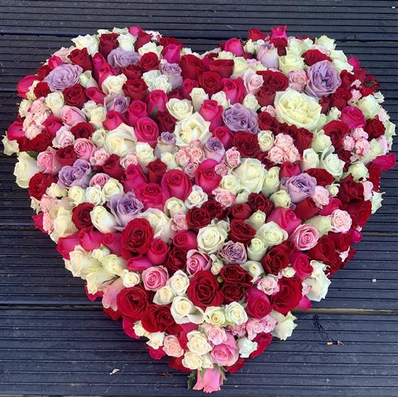 Massed roses in a solid heart . Here we have used a combination of red , pink and ivory . You can choose any rose colours.