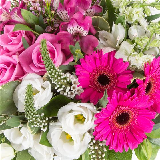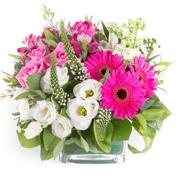 A compact cube arrangement of contrasting whites and cerise pinks blooms.