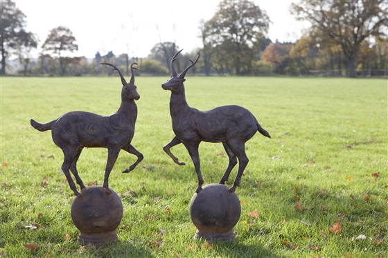 Stunning pair of deers perched on spheres . Stunning as a garden feature.Dimensions 55 x 20 x 95 cm