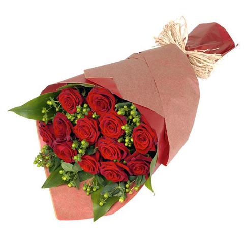 Classic and beautiful compact bouquet of a dozen red Roses, hypericum berries and complementary foliage wrapped as a traditional bouquet.