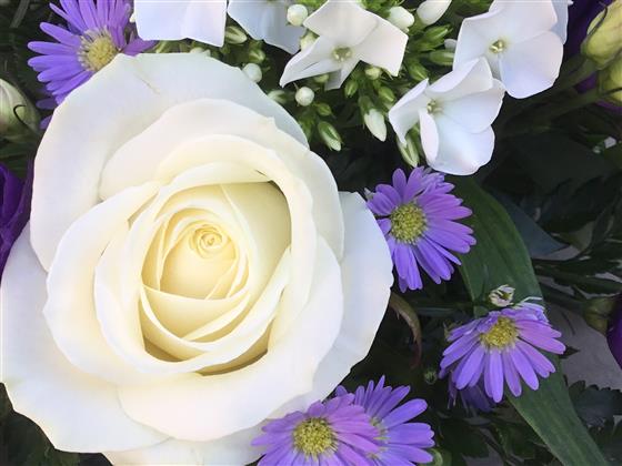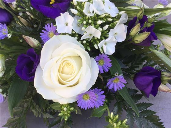 Lovely jar of seasonal flowers in Shades of purple and white flowers .