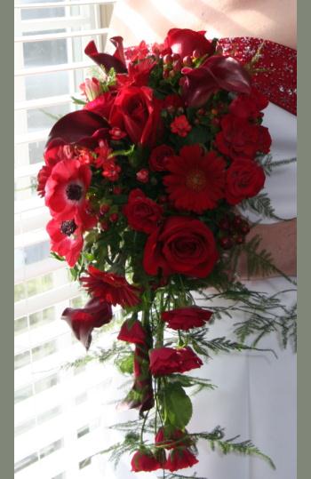 A traditional shower bouquet, with red roses, red anemones.red germini,hypericum berries,red bouvardia and red sox calla lilys.Available all year round