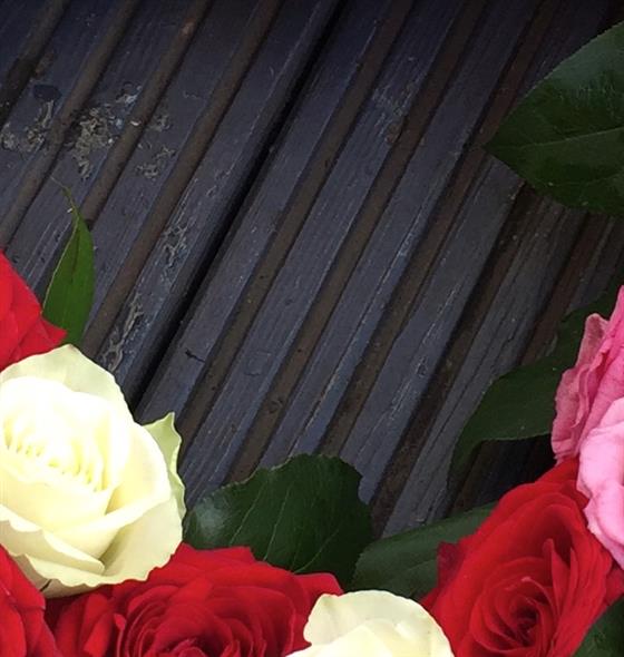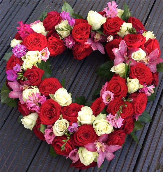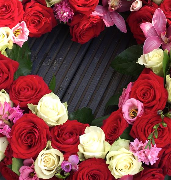 Romantic red and ivory roses with a touch of pink combine to make a fitting tribute.