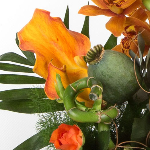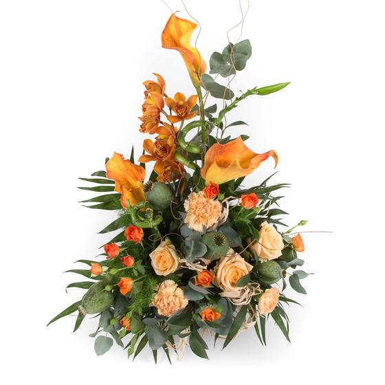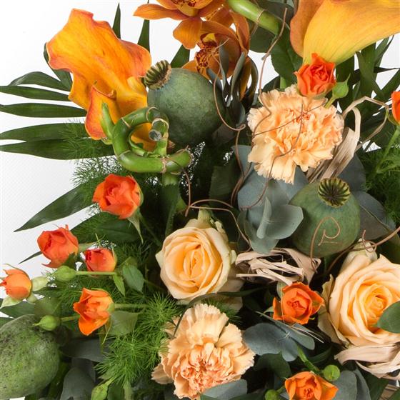 An exotic mix of peaches, oranges and limes including mango calla lilies and spray roses.