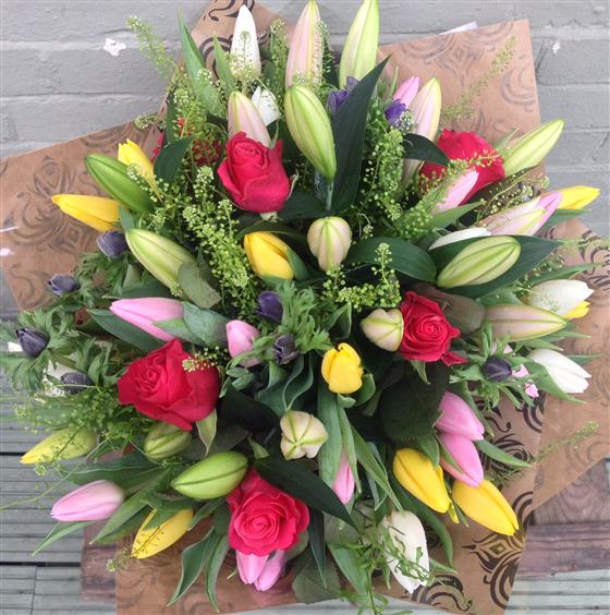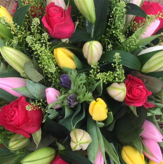 Stunning cheerful spring bouquet with scented oriental lilies , tulips and roses