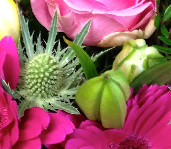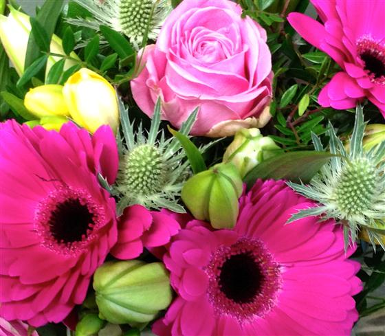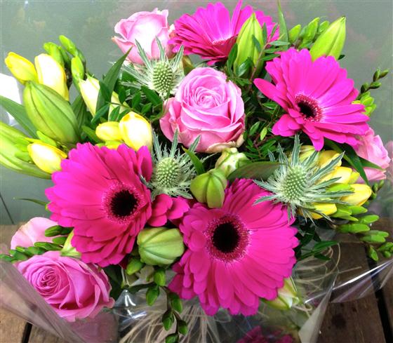 Combination of cerise gerberas , roses , freesias and chrysanths