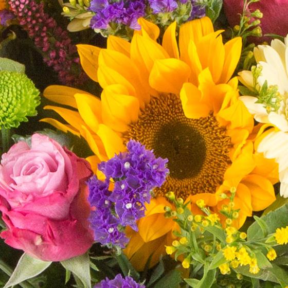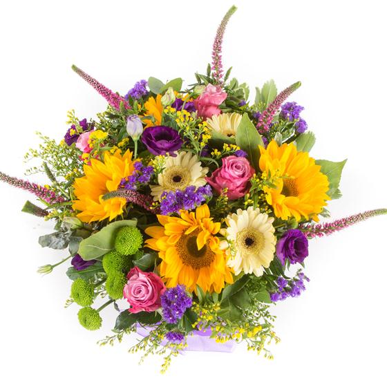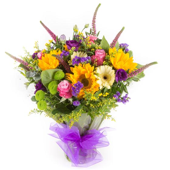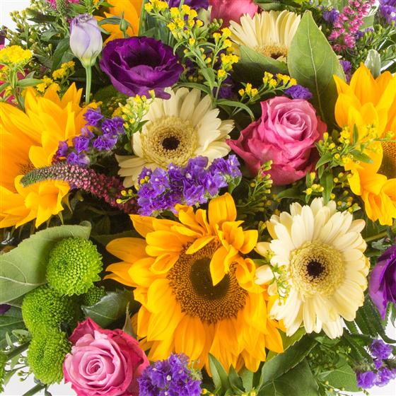 Send a ray of sunshine with this colourful selection of golds, purples and bright pinks. To avoid disappointment please contact us to check sunflower availability.