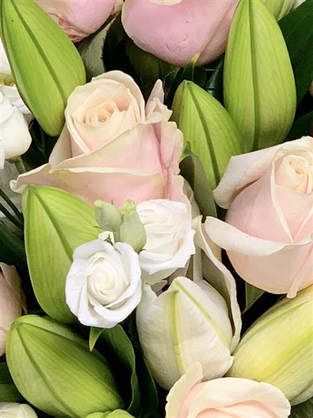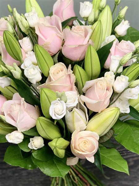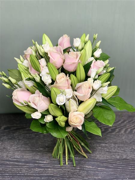 Pale Pink roses and white oriental lilies combine to create a stylish elegant display.