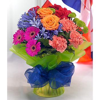A hand-tied aqua packed bouquet simply bursting with colour. Orange Roses, cerise Germini and blue Agapanthus expertly combined and beautifully presented.