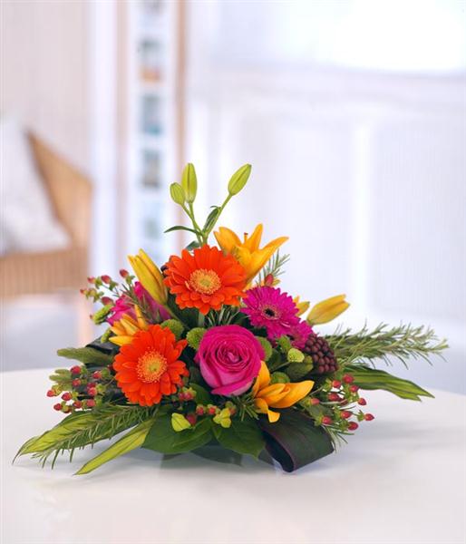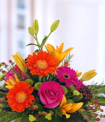 A charming mixed arrangement featuring pink Roses, orange Lilies, Gerbera and Chrysanthemums. Flowers are arranged in floral foam in a green plastic container for long lasting freshness and easy display.