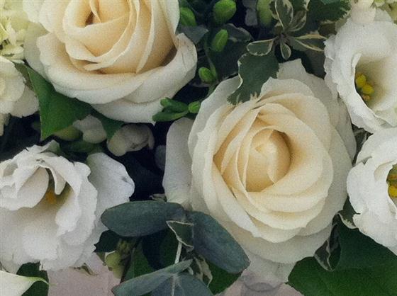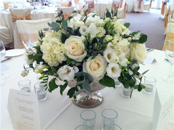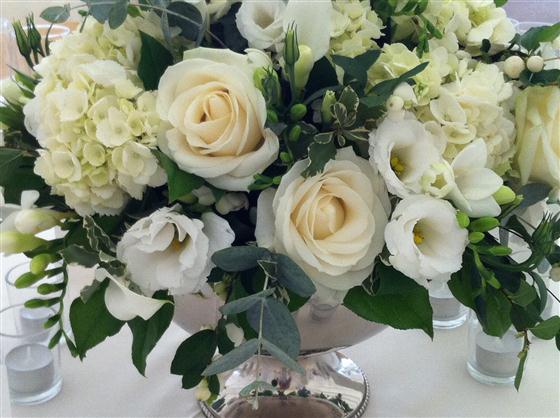 Classic white arrangement with roses , lissianthus ,hydrangeas and foliage.