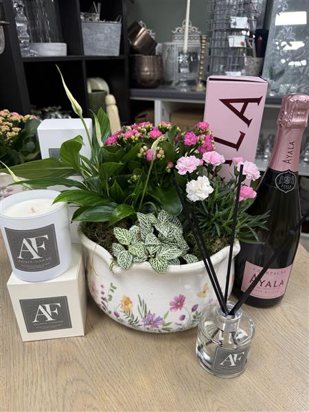 Ayala rose champagne , luxury basil and neroli room diffuser, eucalyptus , lemon and mint luxury candle and a gorgeous ceramic planter filled with indoor plants .