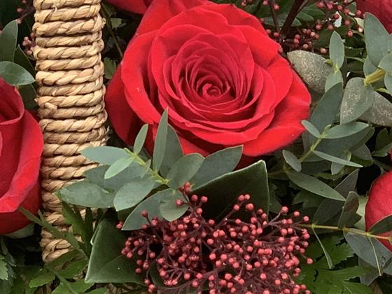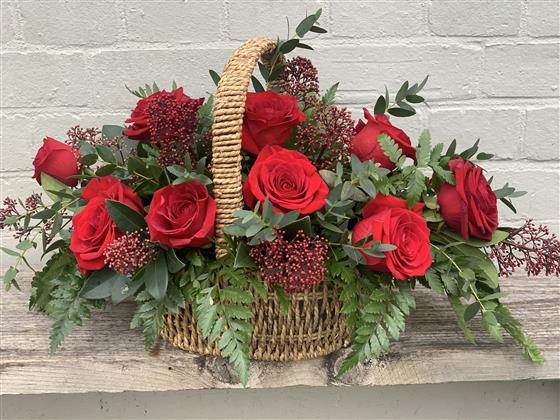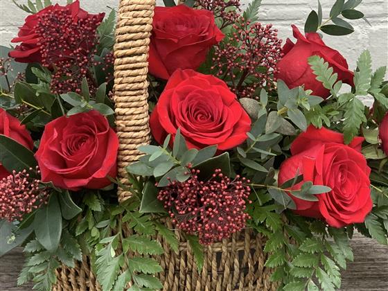 Stunning 12 best red roses with eucalyptus in a rustic sea grass basket