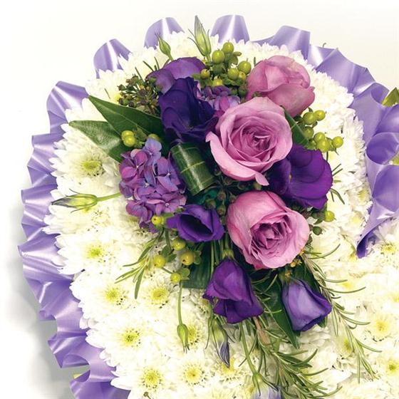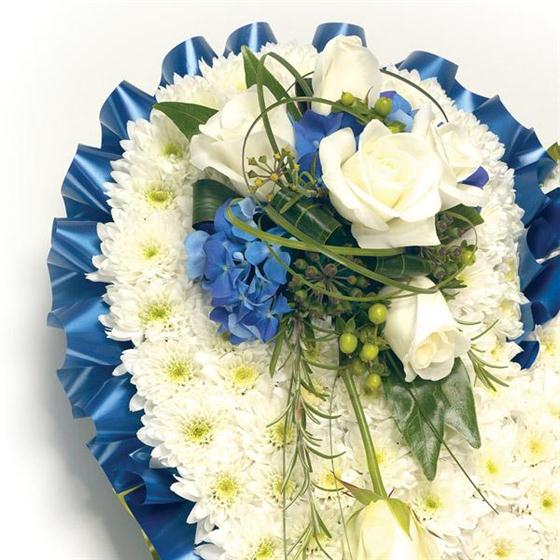 Classic red and white Chrysanthemum based heart shaped tribute with Roses, Freesia & Hypericum and complementary foliage edge.