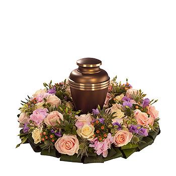 A pretty urn wreath base. Pink and cream Roses, pink Hydrangea and Hypericum with purple Lisianthus and white Eryngium. Urn not inclulded.