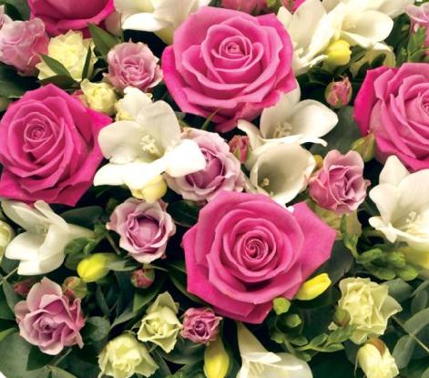 A delicatly fragrant pink and white posy pad featuring pink and white Roses and white Freesias.